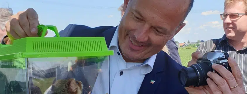 Frank Rock begleitete NRW-Umweltministerin Ursula Heinen-Esser und Landrat Michael Kreuzberg nach Pulheim-Geyen, um bei der Aussetzung der Nagetiere dabei zu sein. Insgesamt wurden 128 Hamster aus Erhaltungszucht in die Freiheit entlassen. Die Landwirte in Pulheim stellten dafür 7 Hektar Agrarfläche zur Verfügung.